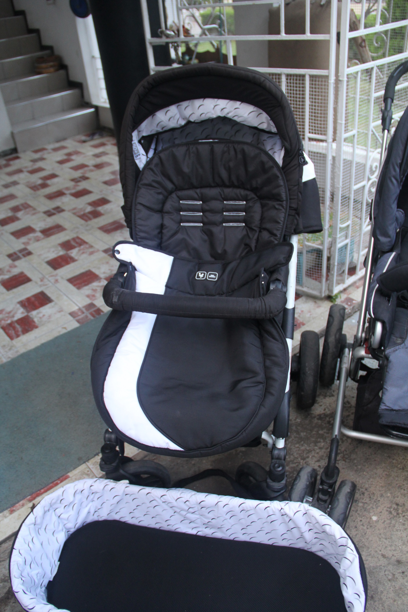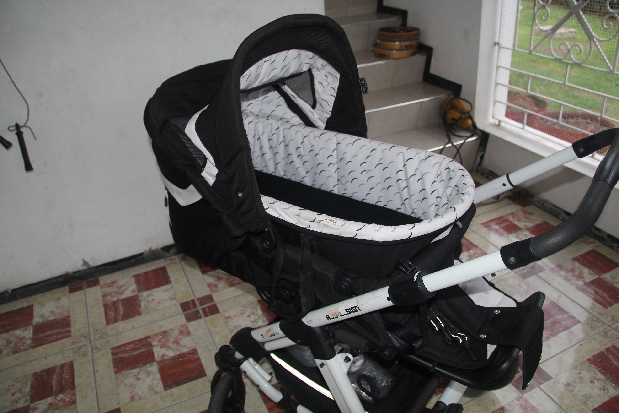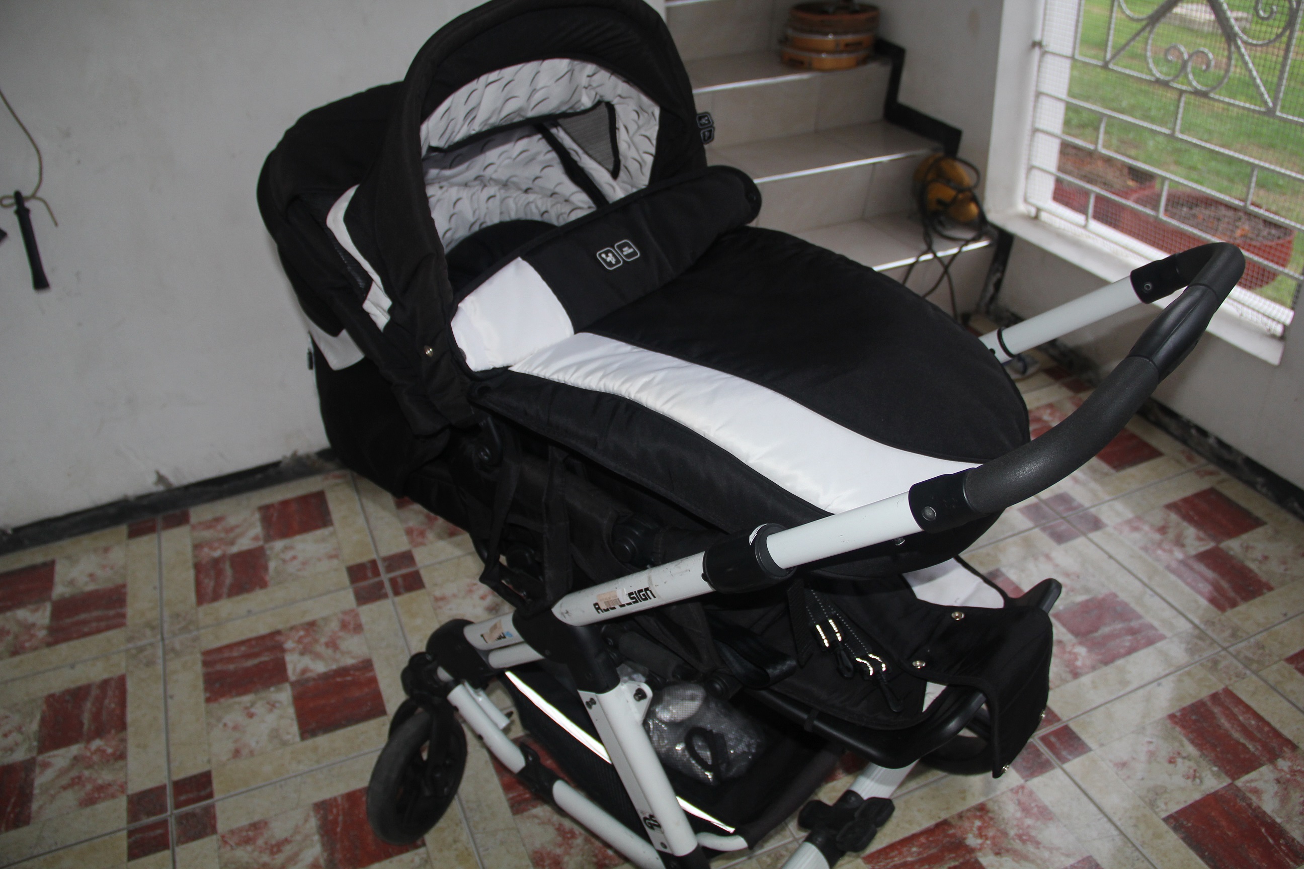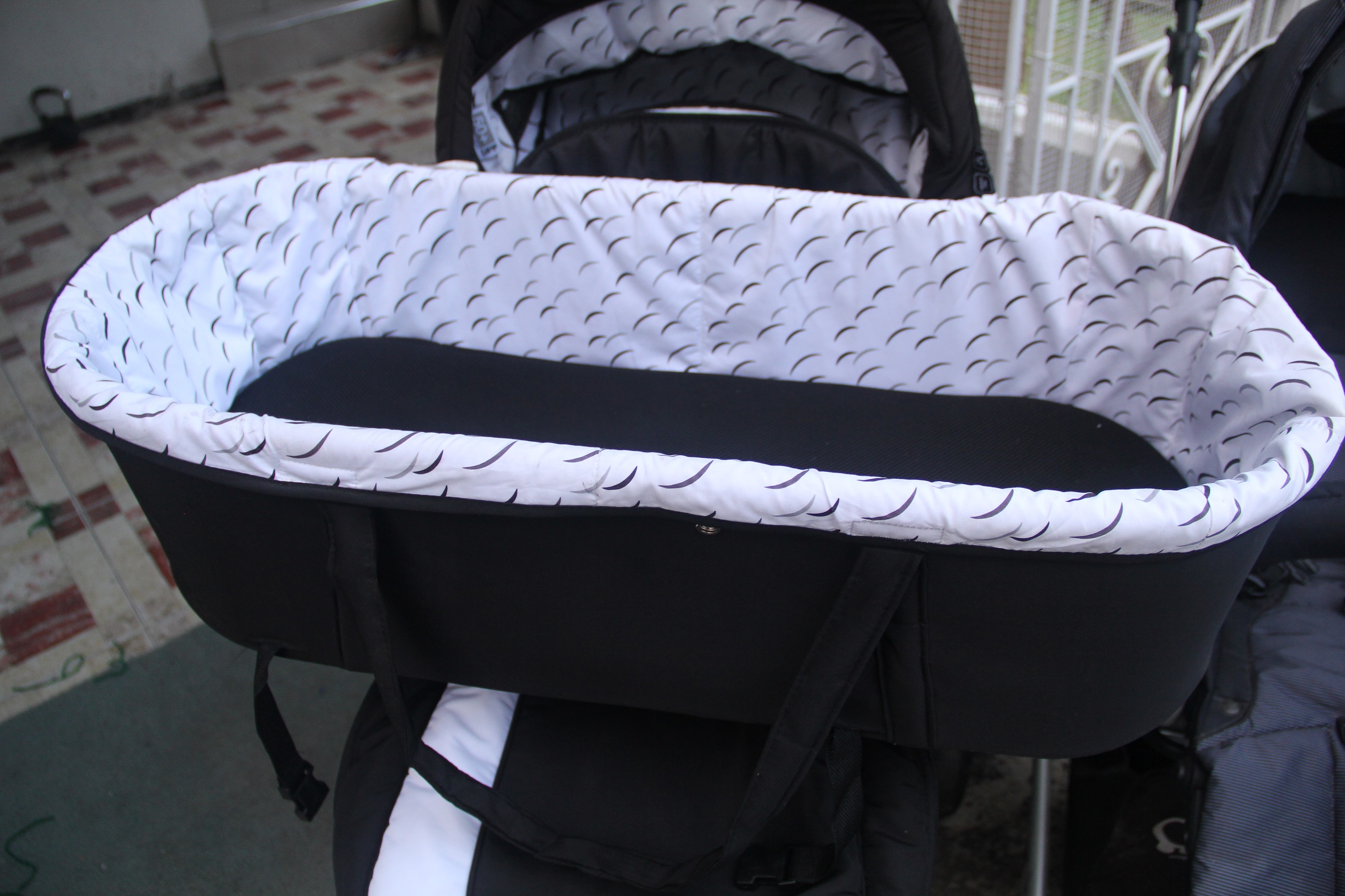 Sleek black and white with a lux comfy baby bassinet with handles to transports sleeping babies. Also comes with rain cover and winter cover to keep baby or child warm (in cold countries)